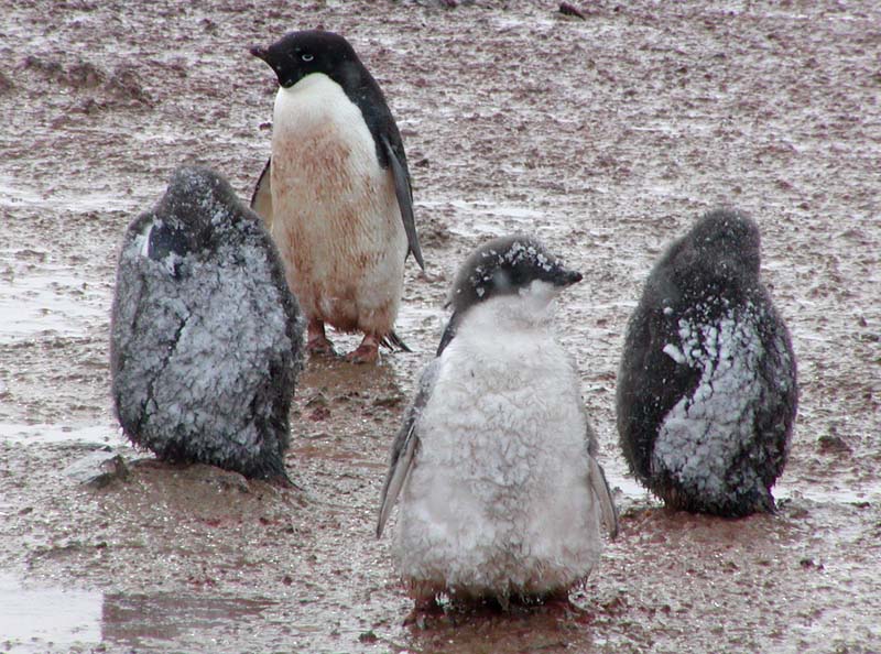Adelie Penguins in the snow at Heroina Island, Antarctica - January 30, 2005.